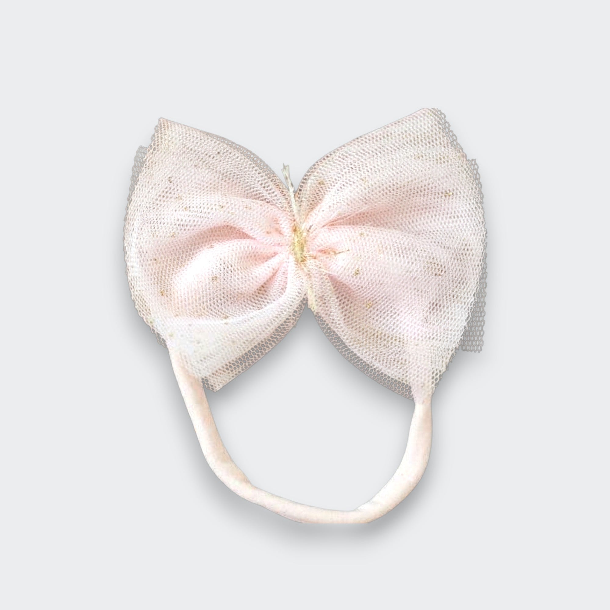 Delicate and dreamy, this pale pink bow headband brings a soft sparkle to your little one’s everyday style. The pale pink bow is accented with subtle gold shimmer, creating a magical, fairytale-inspired touch. Crafted with a gentle, stretchy nylon band, it fits comfortably on newborns, infants, and toddlers while staying secure through play and adventures.