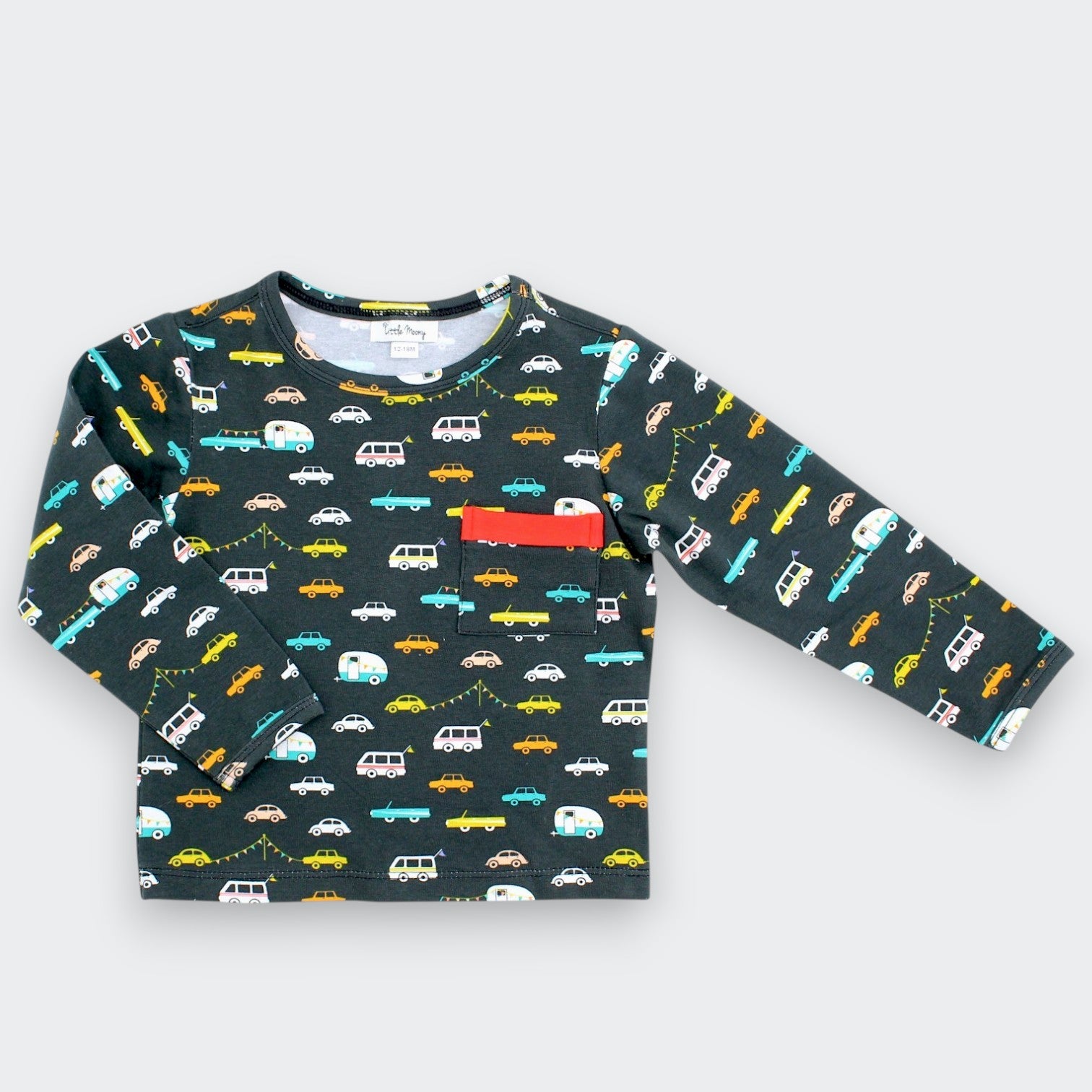 From playground adventures to cozy book corners, this cotton long-sleeve tee keeps them comfy in style. The fun all-over car print and signature red pocket trim make it uniquely Little Moony. Pairs perfectly with knit joggers for relaxed days or corduroys for