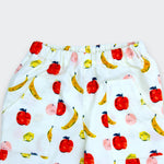 Playful and comforting, the Little Fruit Patch Straight Pants bring a touch of everyday joy to a child’s wardrobe. Scattered across a soft creamy ground, hand-drawn apples, bananas, and citrus fruits feel cheerful and nostalgic, like a favorite picture book brought to life. The print is lively yet gentle, designed to delight without overpowering.