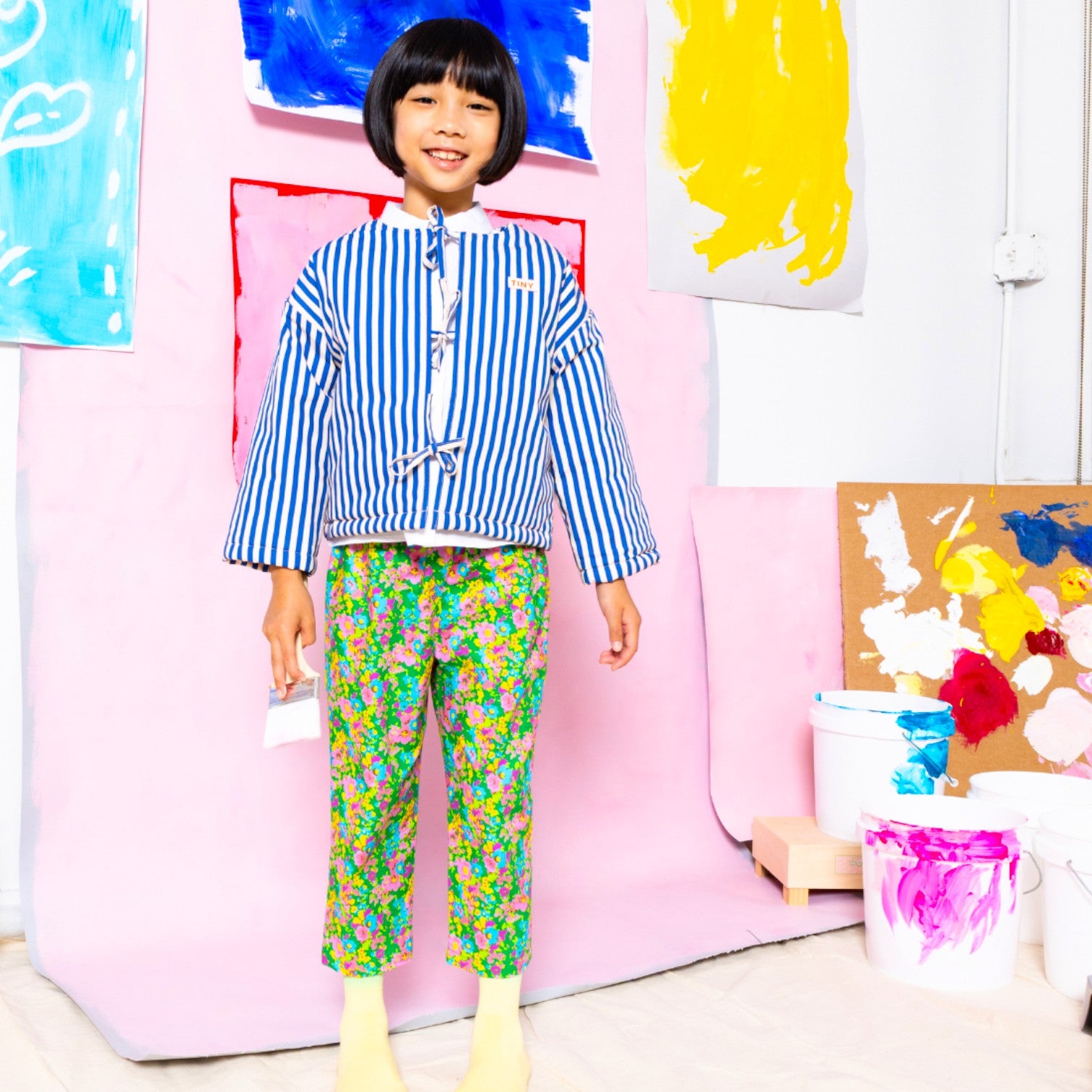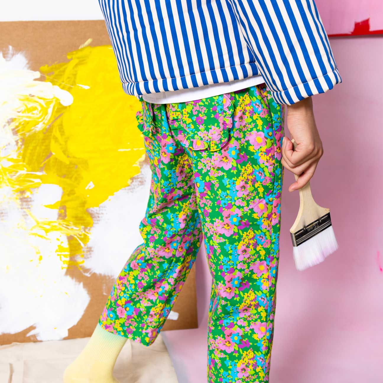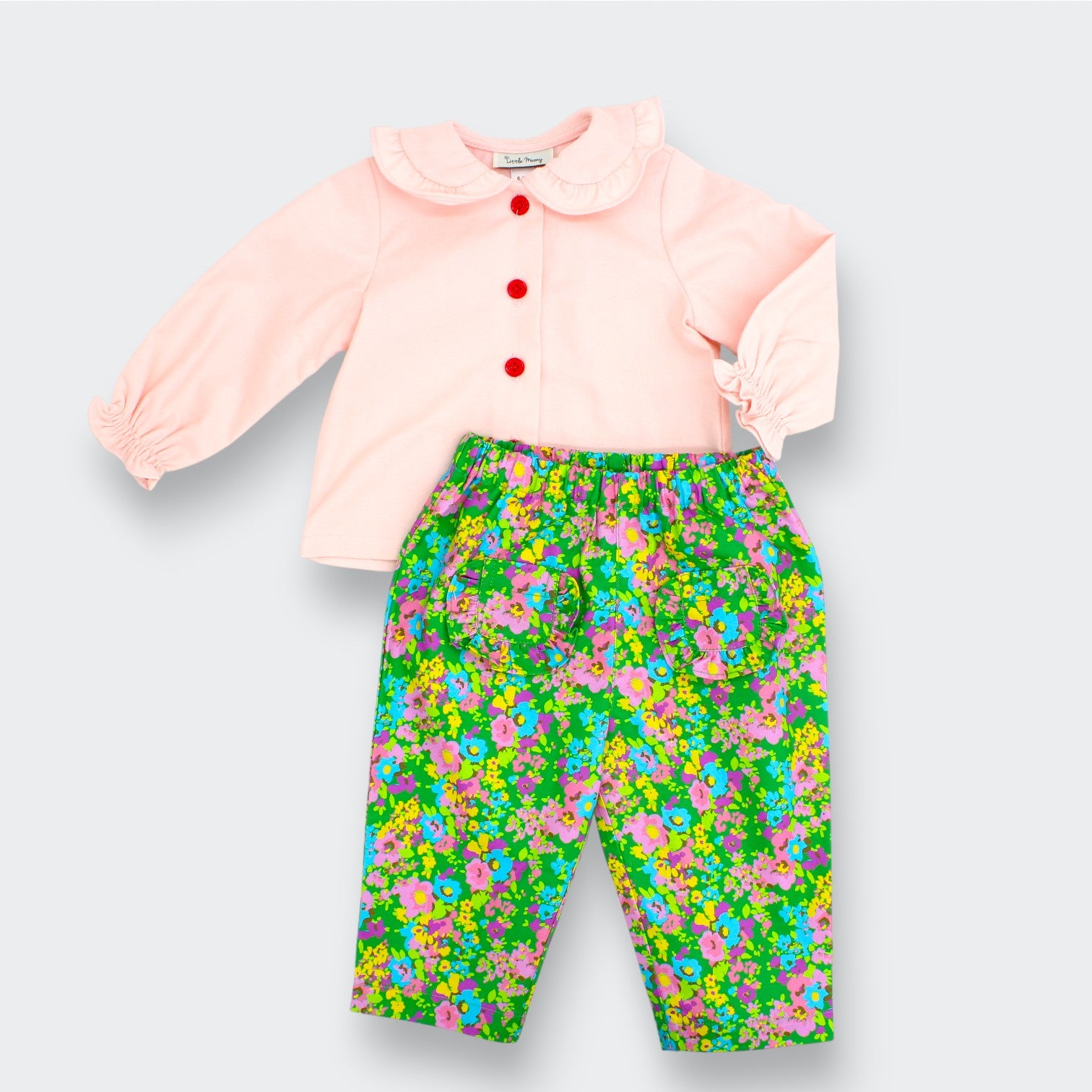 A joyful expression of color and comfort, these straight pants are designed to move gently through a child’s day. Set on a vivid green ground, a lively scatter of florals feels playful yet timeless, like a memory of spring carried from one adventure to the next. Thoughtfully proportioned with a clean, straight silhouette, this piece offers ease without excess volume, making it both charming and practical.