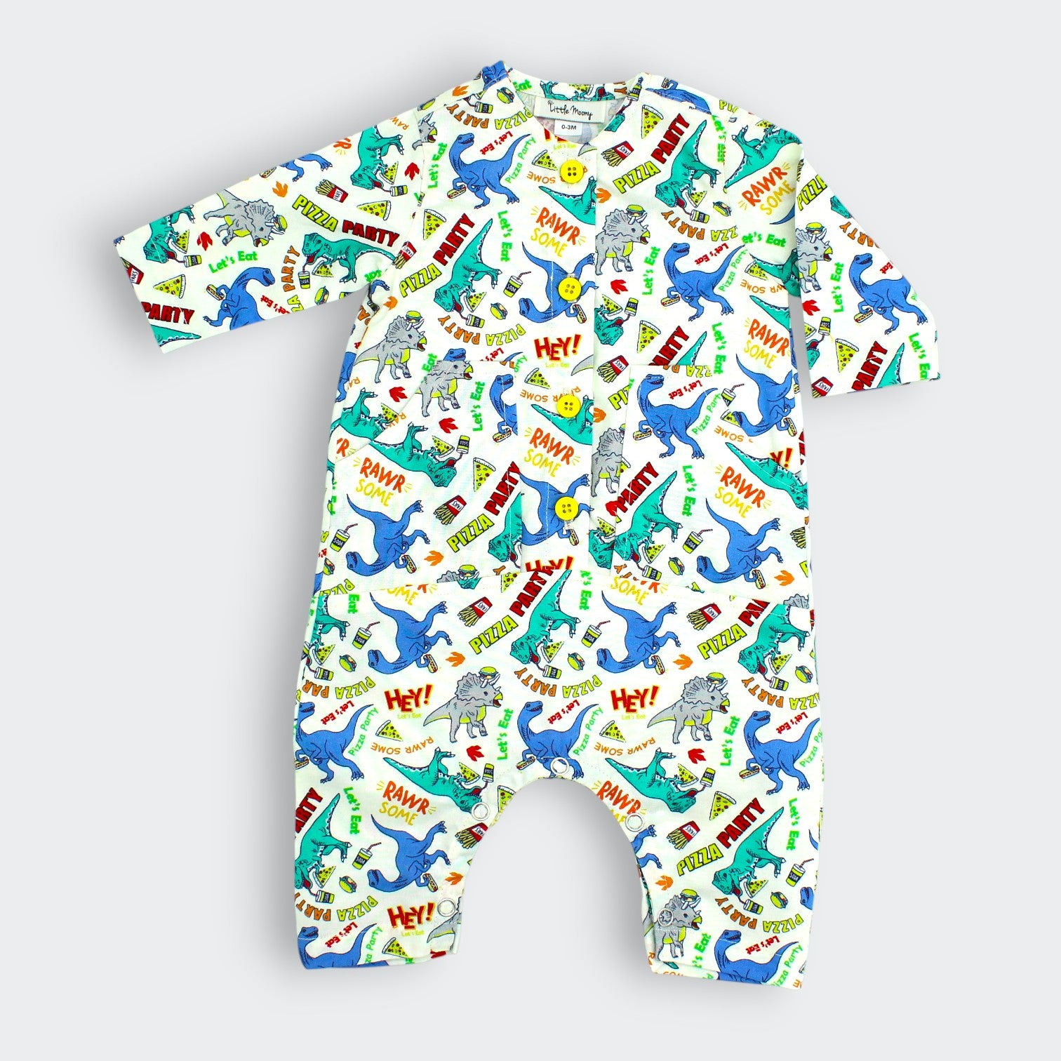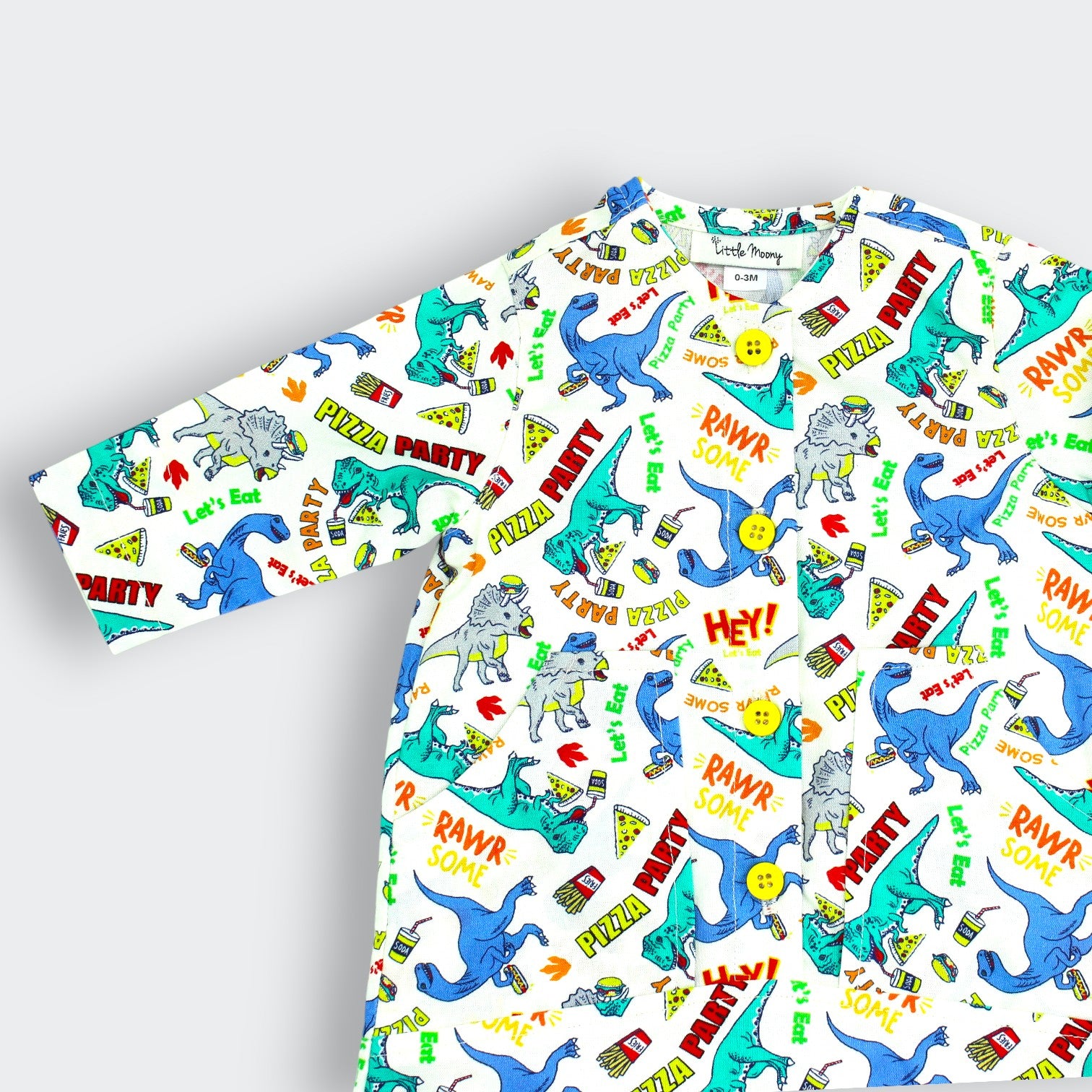 Play meets imagination. This cheerful baby romper serves up a whimsical dino-and-pizza print on a soft white ground, bright pops of teal and sunny buttons bring a joyful spark to everyday moments. Cut from breathable cotton that feels gentle against delicate skin, it moves easily from tummy time to park play, giving little explorers room to wiggle, crawl, and dance through their day. A playful staple of handmade children’s wear with that Little Moony balance of style and substance.