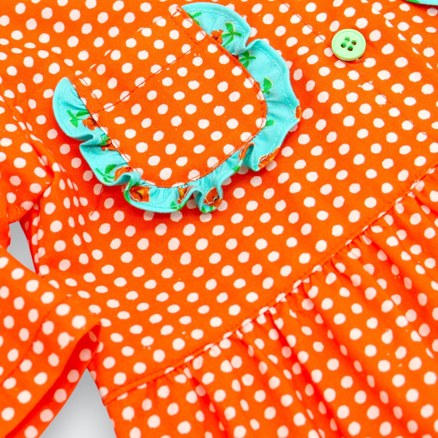 - Design: Button front bodice with two contrast ruffle trim pockets for tiny treasures